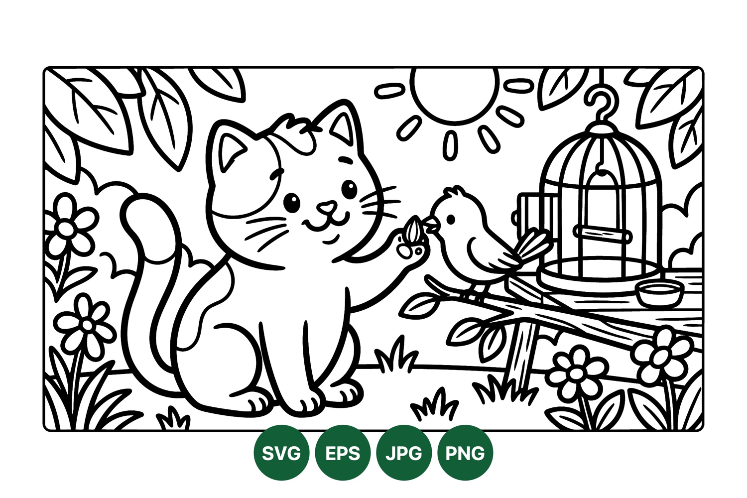 Cute Animal Illustration Animal Coloring Page Kid Friendly Clipart Simple Line Drawing Hand Drawn Cat Art Playful Pet Design Children Activity Art Spring Nature Drawing Bird In Garden Garden Scene Illustration