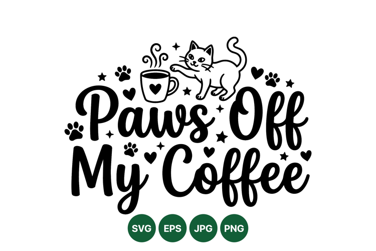 A charming black and white vector design featuring a cat paw touching a steaming coffee cup with hearts and paw prints surrounding the phrase paws off my coffee in playful style.