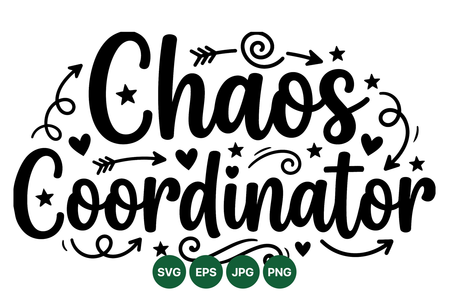 Svg Cut File Modern Calligraphy Svg Chaos Coordinator Clipart Funny Quote Design Digital Craft File Script Lettering Design Printable Typography Art Playful Office Humor Whimsical Arrow Elements Heart Star Doodle