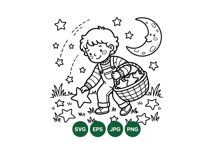 A cheerful boy collects stars in a basket outdoors at night beneath a crescent moon and twinkling stars in simple black line art perfect for coloring or children themes