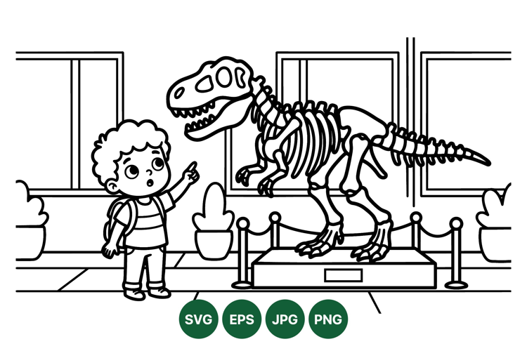 Young boy with curly hair and backpack points with curiosity at a large dinosaur skeleton displayed inside a museum with plants and ropes in black line art style illustration lively educational mood