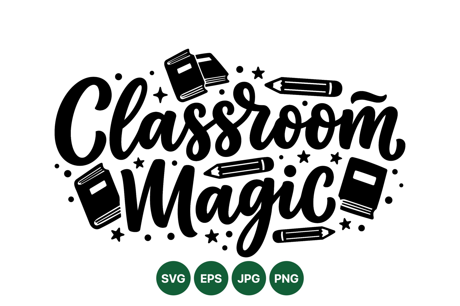 Elegant hand lettering spelling classroom magic surrounded by pencil and book icons in vector style suitable for educational themes and inspirational designs