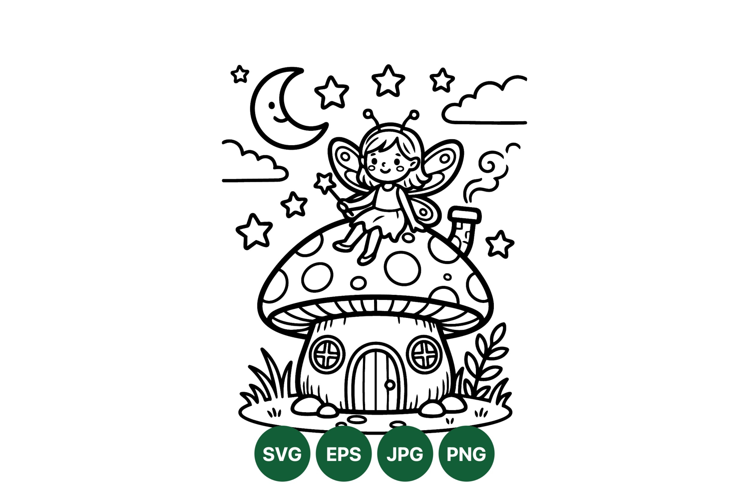 A whimsical fairy with wings and antenna sits happily atop a spotted mushroom house amid night sky with moon stars and clouds in black outline style playful and charming