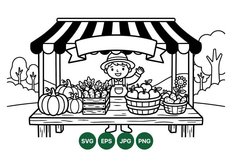 A cheerful child vendor waves from a farmers market stall filled with fresh pumpkins carrots apples potatoes and a sunflower in black and white line art style peaceful