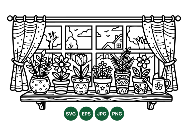 A charming black and white line drawing depicts various smiling potted flowers and plants arranged on a wooden windowsill framed by patterned curtains and a scenic garden outside in a cozy atmosphere