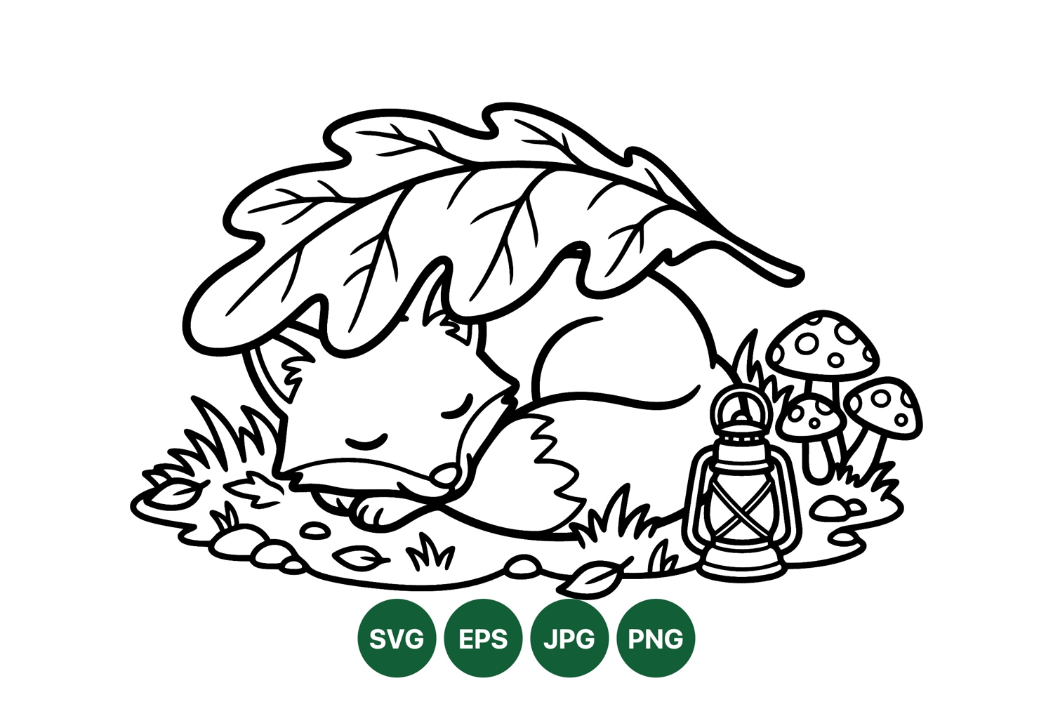 Kids Coloring Page Black And White Svg Woodland Animal Art Hand Drawn Fox Autumn Leaf Art Cute Animal Drawing Sleeping Fox Illustration Forest Nature Design Lantern Line Drawing Mushroom Vector Graphic