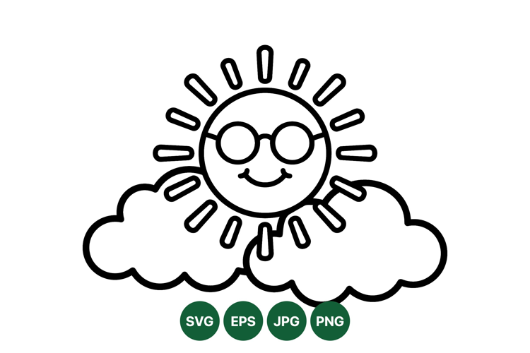 A cheerful sun with round glasses smiles while shining behind two fluffy clouds in a simple black and white vector line art style creating a playful weather illustration.