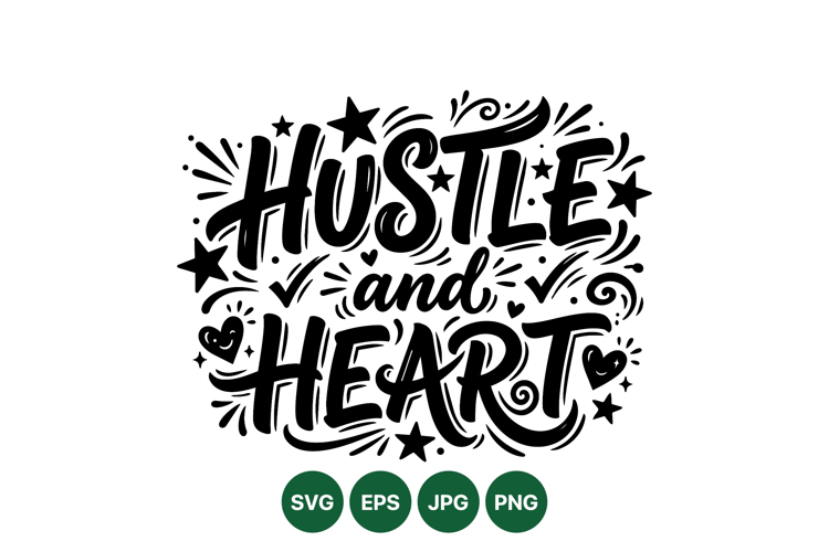 Bold hand lettering displays the phrase hustle and heart surrounded by decorative stars hearts and check marks in a black and white style conveying motivation and determination