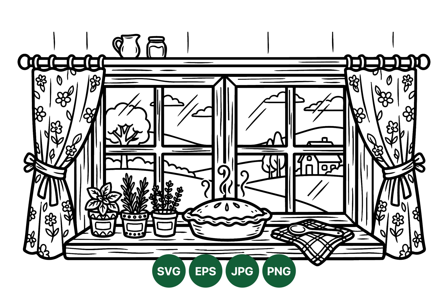 A detailed black and white line drawing shows a steaming pie sitting on a window sill with three potted herbs beside it floral curtains tied back frame the rustic countryside landscape beyond a glass window vibrant and cozy