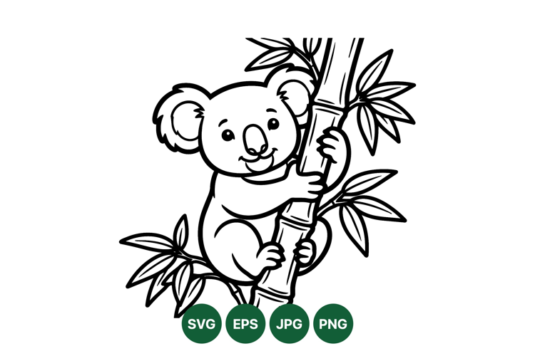 Playful vector art of a happy koala climbing a bamboo branch featuring clean black and white line work and nature details in a simple charming style