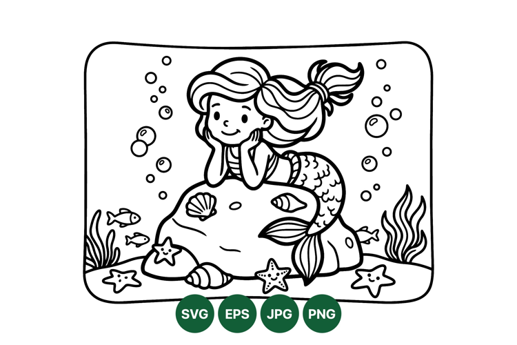 A charming black and white line drawing depicts a happy mermaid resting on a rock underwater with sea creatures and bubbles, perfect for coloring books or children illustrations with a playful mood
