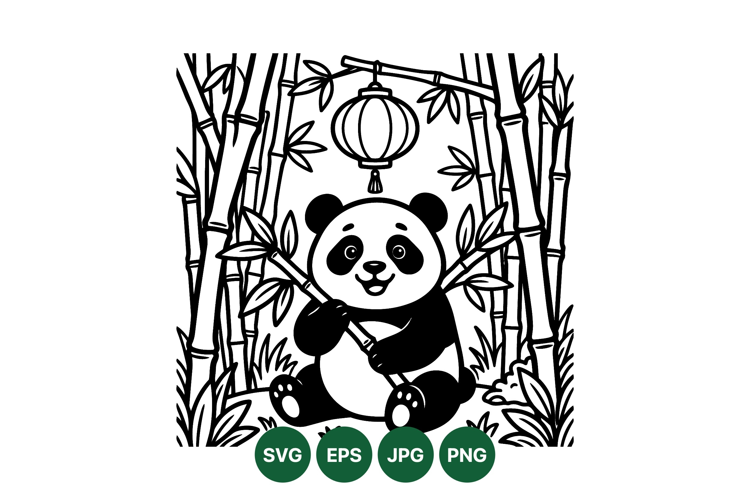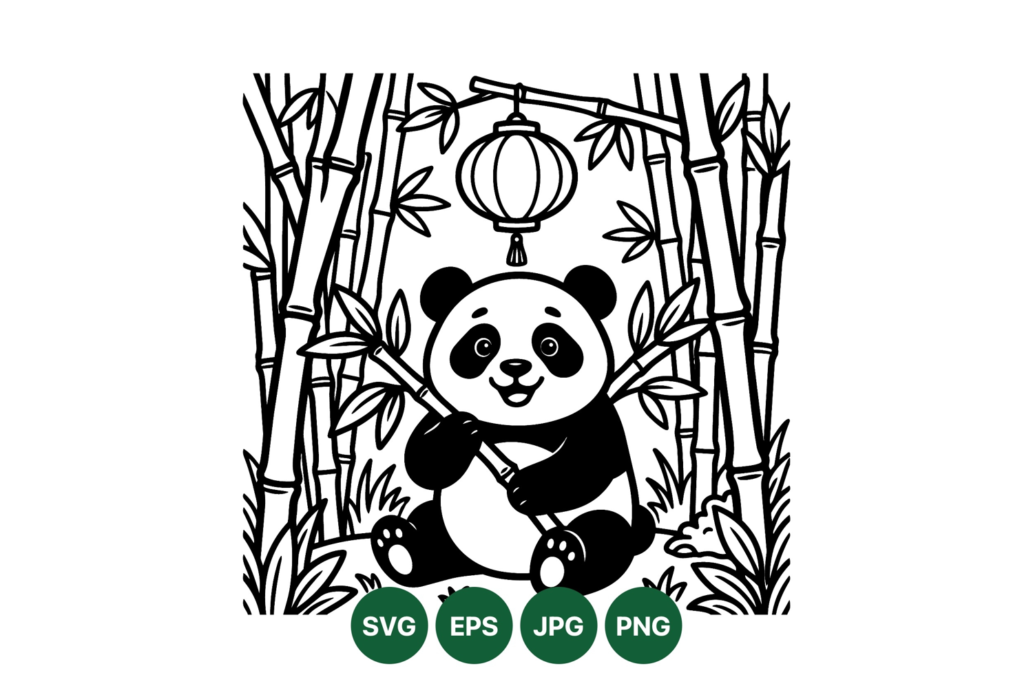 A cheerful panda sits happily clutching bamboo sticks amidst tall bamboo stalks with leaves and a decorative hanging lantern in a detailed black and white vector line art style.