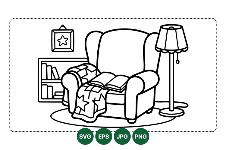 Black and white vector line art shows a cozy armchair with star patterned blanket and an open book next to a standing lamp and bookshelf in a simple interior setting