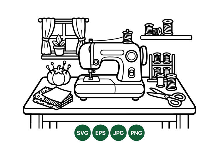 A black and white line art illustration shows a classic sewing machine on a table surrounded by fabric pieces scissors pins spools and a window with curtains and plant creating a vintage crafting scene.