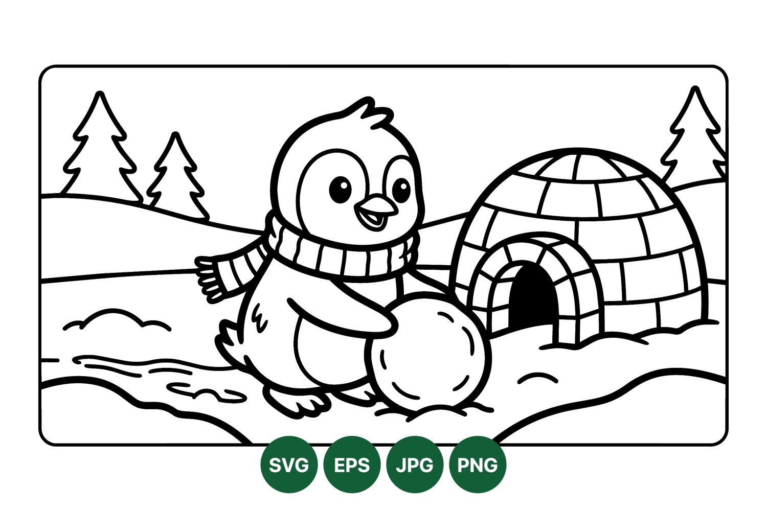 Adorable penguin character dressed in scarf rolling a large snowball near a dome shaped igloo surrounded by snow and pine trees in winter setting peaceful black and white line art style
