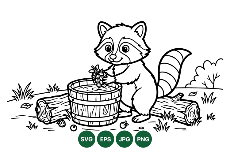 Playful raccoon character washes fresh berries in a rustic wooden bucket surrounded by logs and grass in a black and white line art style vector illustration with charming mood