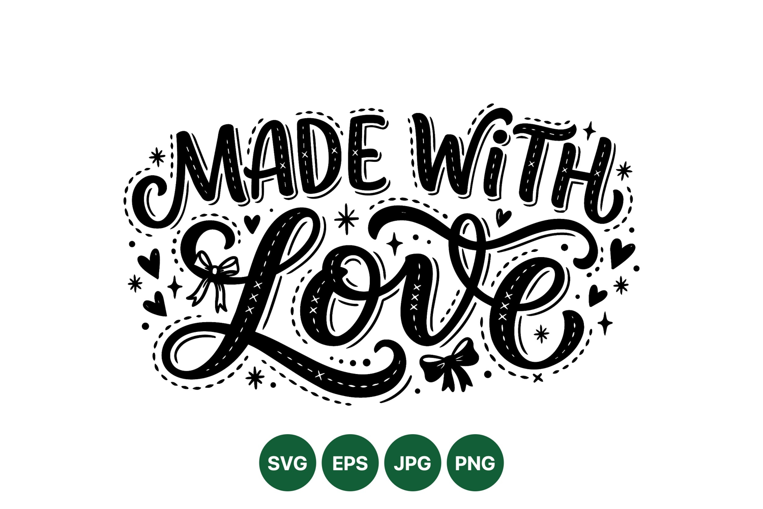 Decorative hand lettering phrase made with love features ribbon bows hearts and star symbols in black and white style perfect for romantic or craft projects elegant mood