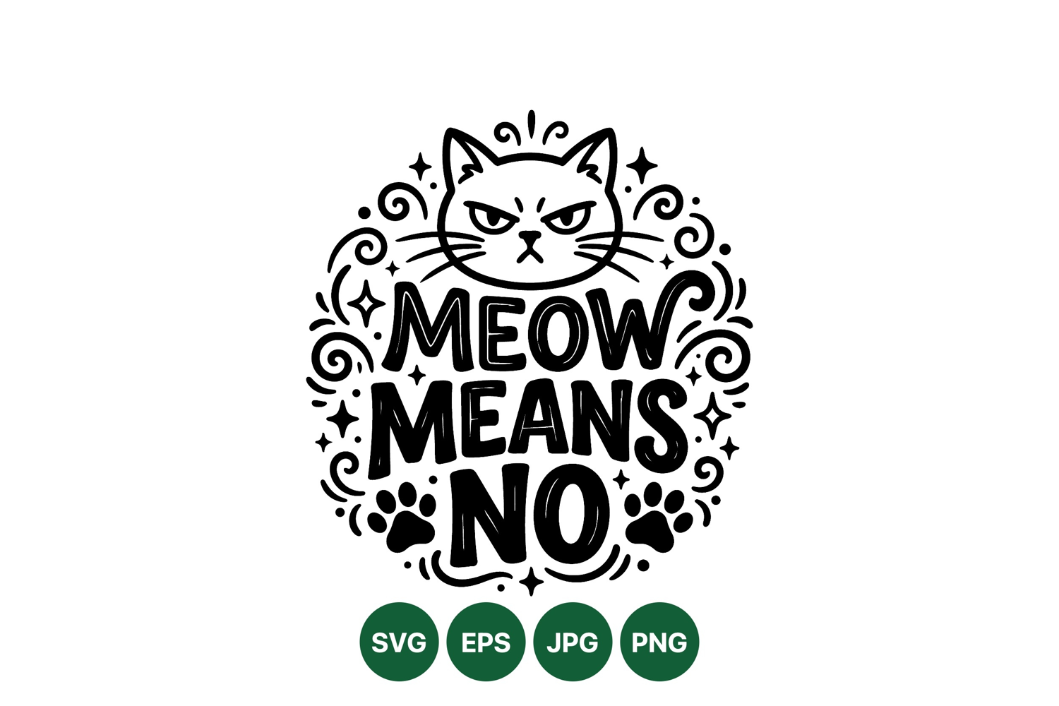 A flat design vector depicts a grumpy cat face above bold letters stating meow means no surrounded by decorative paw prints and swirls in a monochrome style.