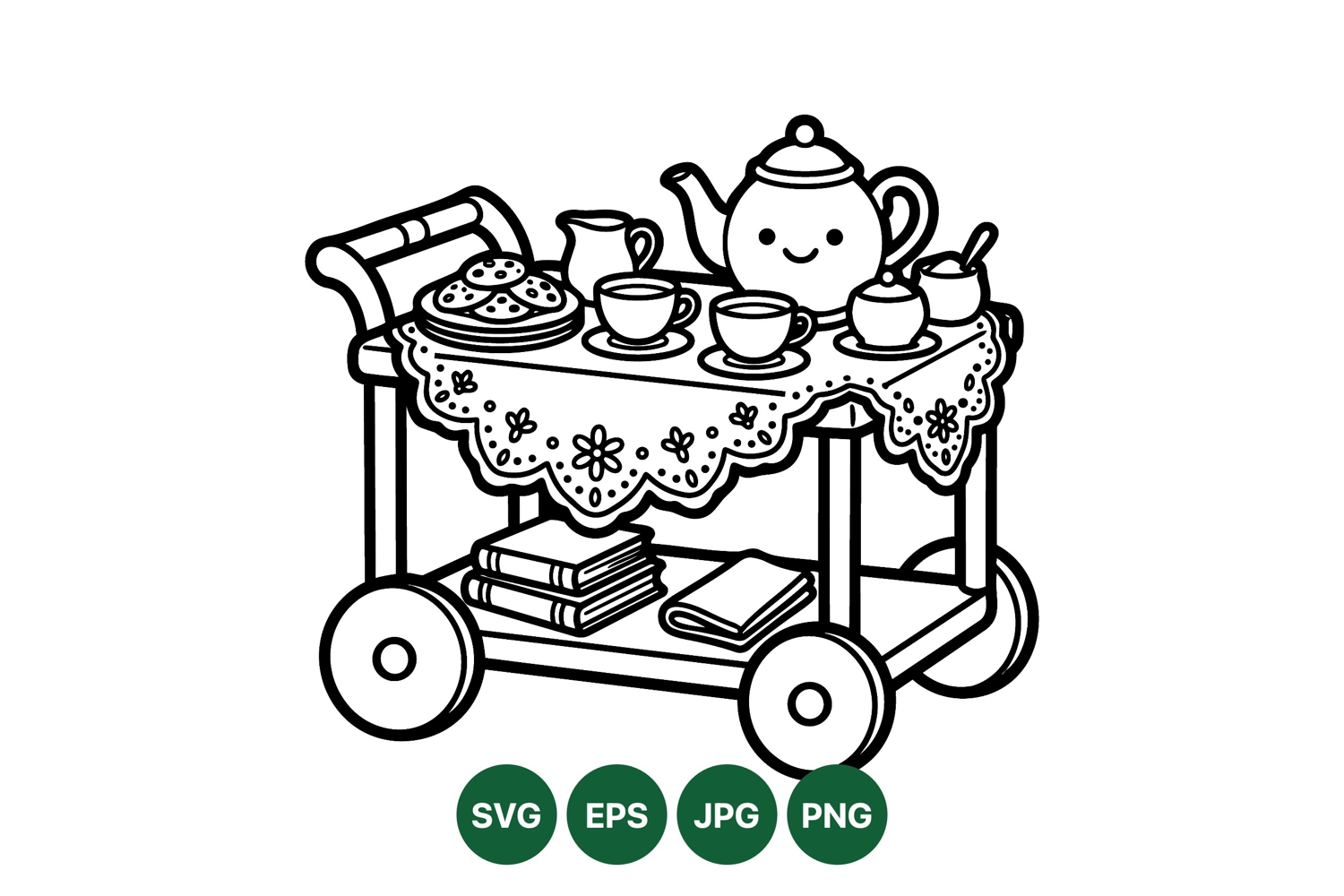 Black and white vector line art showing a rolling tea cart with a smiling teapot cups cookies and books beneath a decorative lace tablecloth cozy and charming style