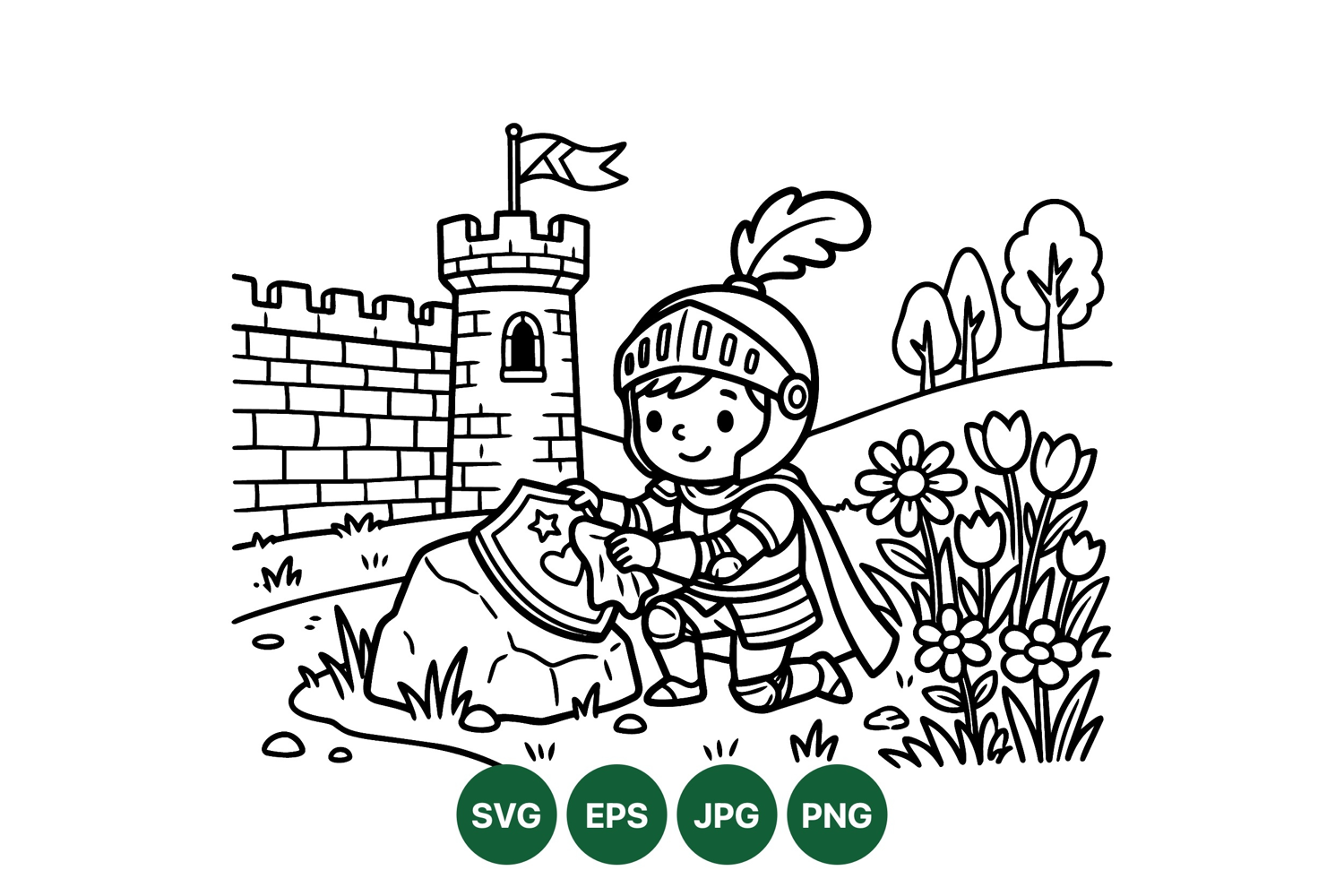 Storybook Character Design Castle Tower Drawing Flower Garden Illustration Medieval Knight Drawing Castle And Shield Art Children Story Illustration Knight Cleaning Shield Line Art Medieval Scene Vector Clipart Knight Young Knight Cartoon