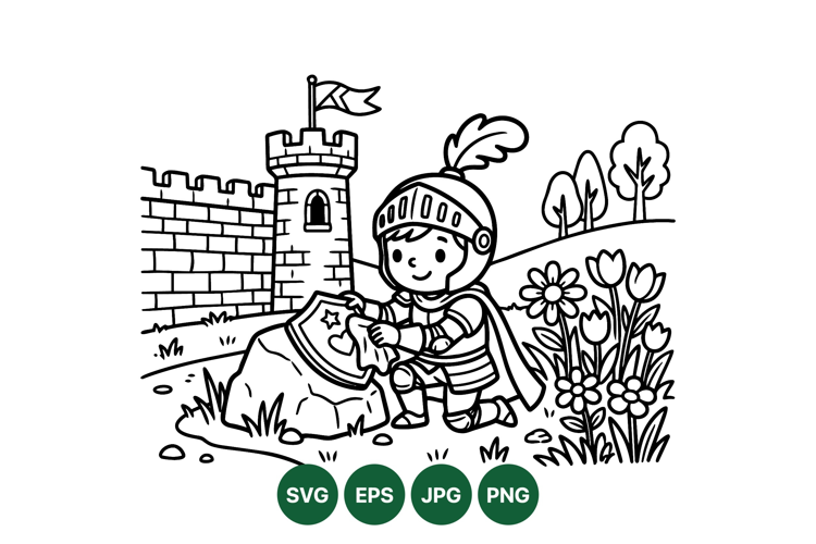 A smiling young knight wearing armor kneels by a rock polishing a decorated shield near a stone castle and flowering plants in a charming cartoon black and white style peaceful scene