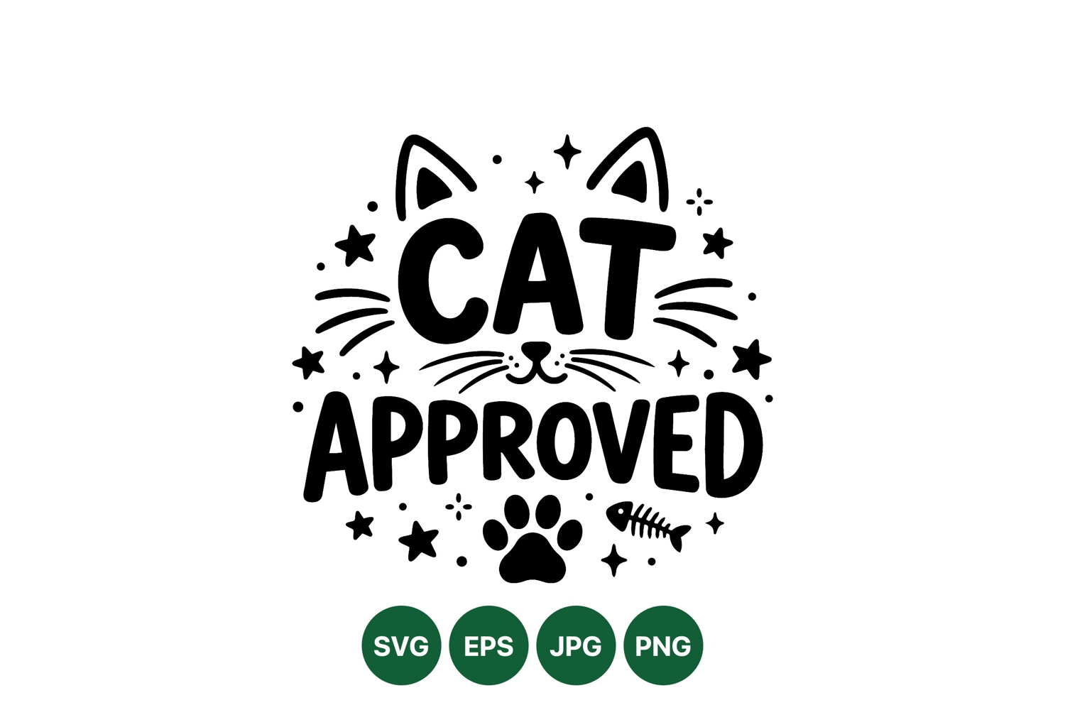 A black and white vector art shows cat ears whiskers and nose with the text cat approved surrounded by paw print fish bone and stars decoration in minimalist style