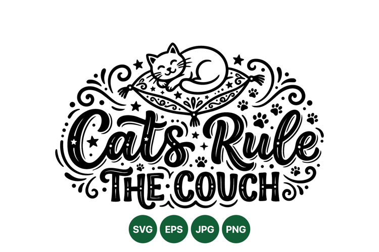 Hand drawn black and white vector features a smiling cat sleeping on a decorative pillow with paw prints and whimsical text cats rule the couch in playful lettering.