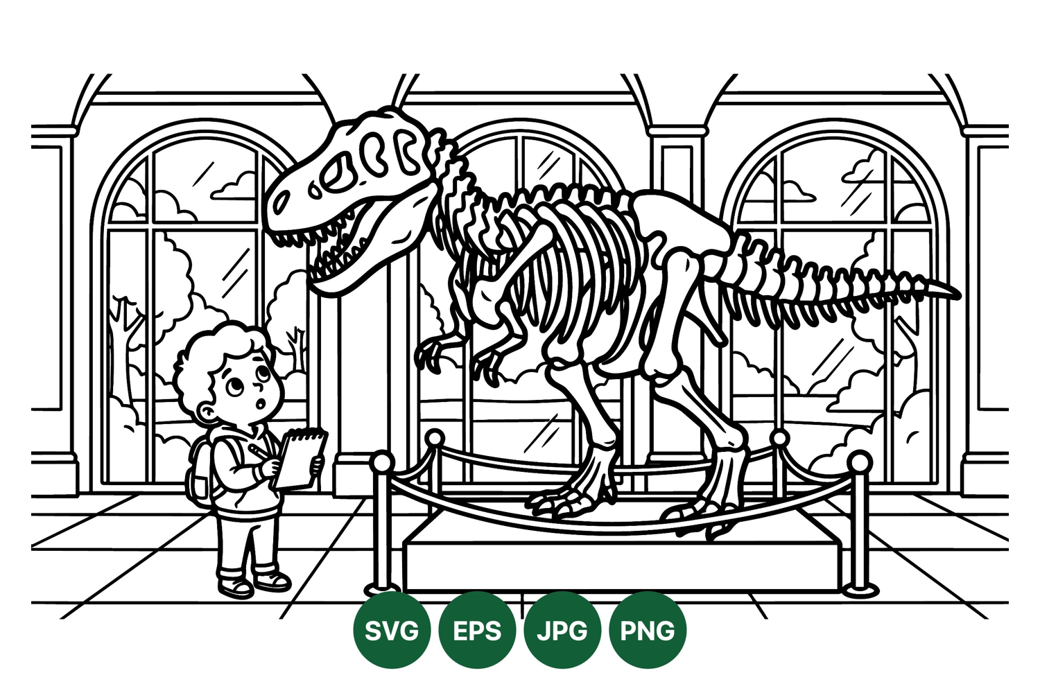 A curious child with a backpack sketches a detailed dinosaur skeleton displayed in a museum hall featuring large arched windows and a scenic outdoor landscape view creating a contemplative mood