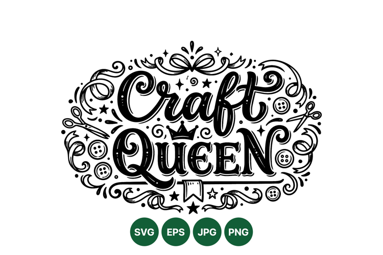 Elegant black and white hand lettering spells craft queen surrounded by decorative swirls scissors buttons and stars in a vintage ornamental style suitable for crafts and hobbies designs
