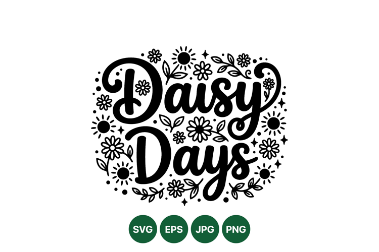 Bold hand drawn typography spells out daisy days surrounded by small flowers leaves and sun shapes in black and white vector style with decorative floral accents peaceful mood