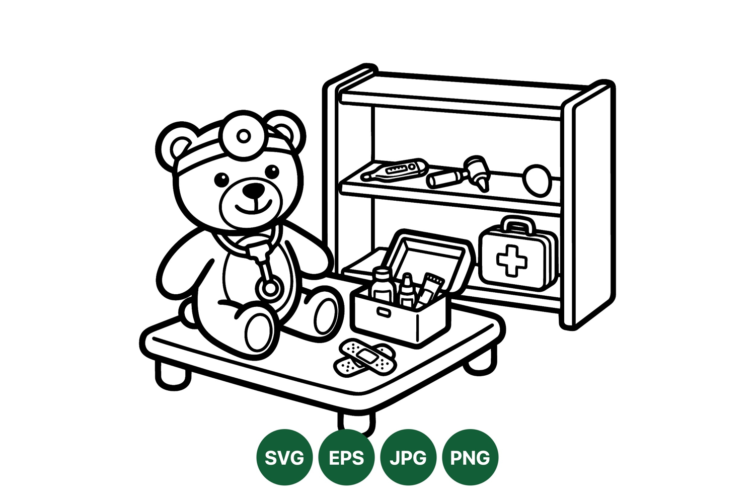 A playful line art vector depicting a teddy bear doctor with stethoscope sitting on a table alongside a medical kit and a shelf with doctor tools in monochrome style, charming and clean.