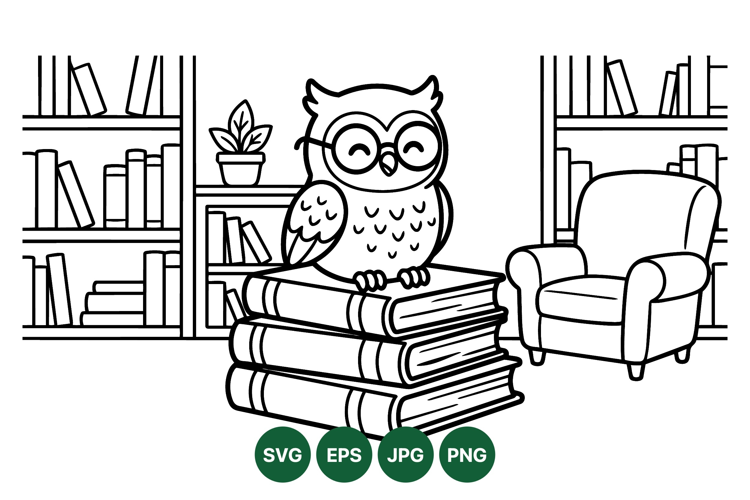 A charming owl wearing glasses perches on a pile of books in a home library setting with shelves full of books and a comfortable armchair in line art style peaceful and inviting