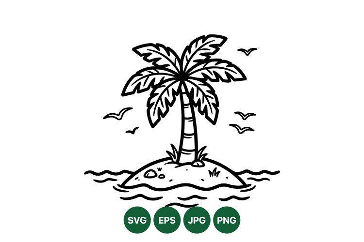 Minimalist line art depicts a single palm tree on a small island surrounded by wavy water and several birds flying above in a peaceful scene.