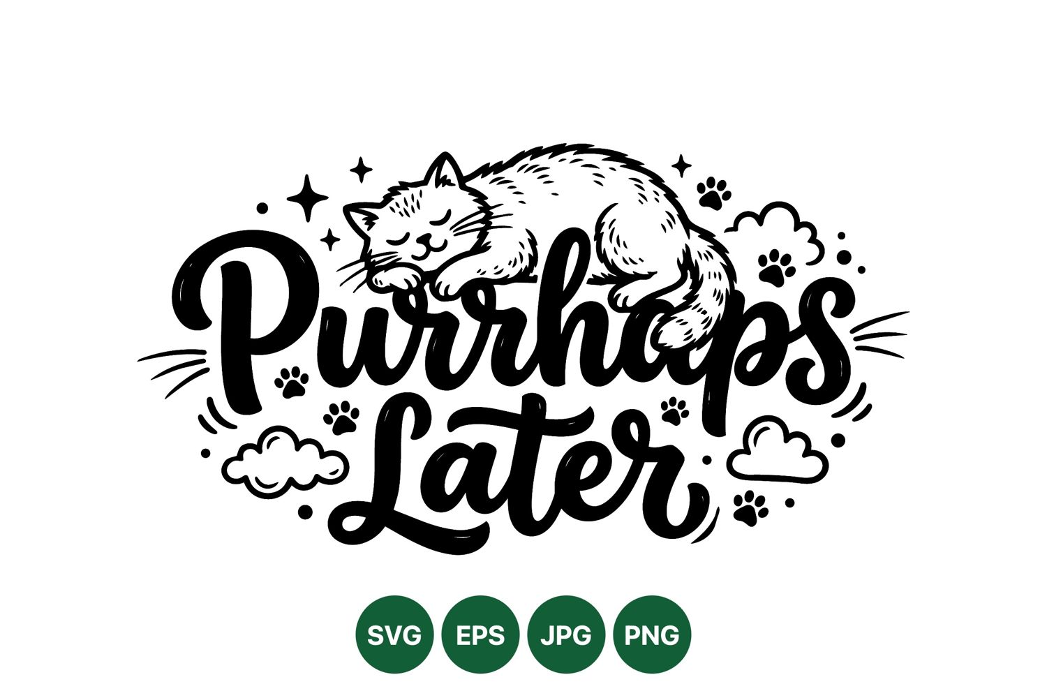 A charming black and white vector shows a sleeping cat curled on stylized playful text purrhaps later surrounded by clouds and paw prints in a relaxed mood.