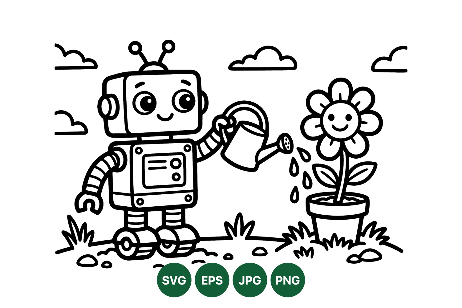A friendly robot waters a happy smiling flower growing in a pot outdoors with clouds and grass visible background in simple black and white line art style colorful garden illustration peaceful