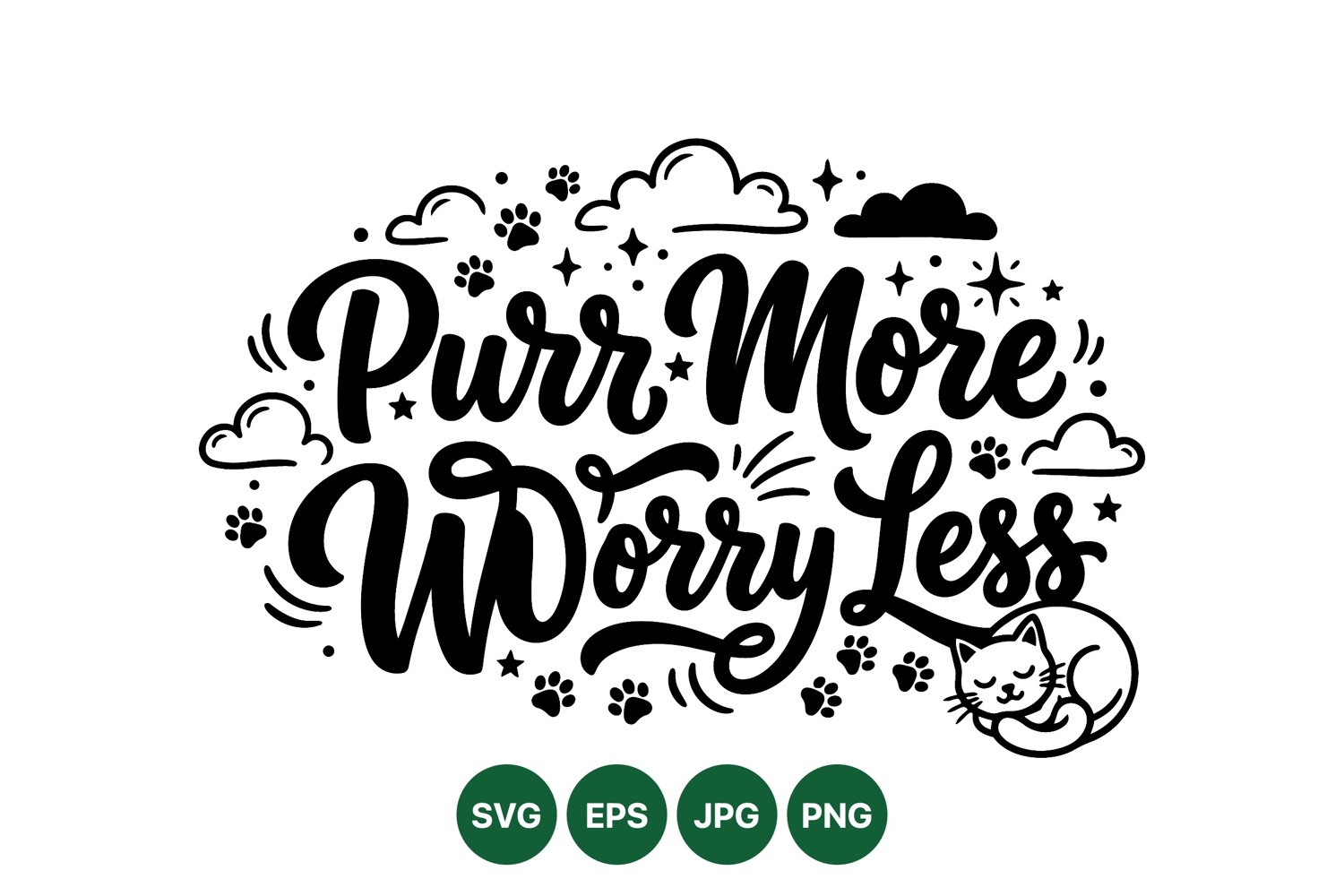 A charming hand lettering design featuring the phrase purr more worry less with a sleeping cat illustration, paw prints, and cloud elements in black and white style, peaceful mood.