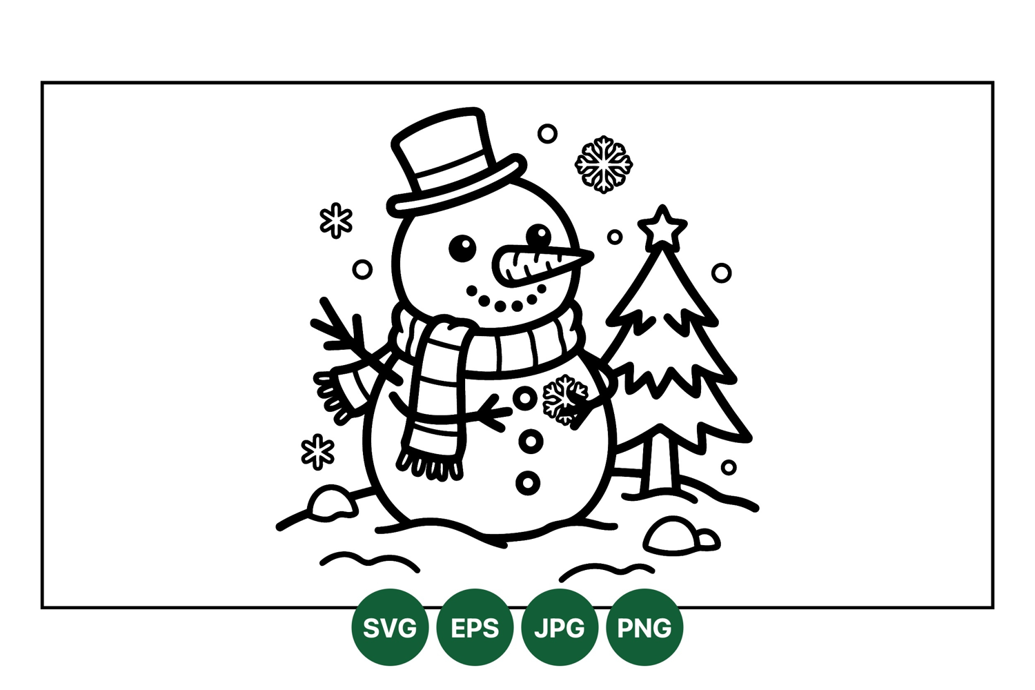 Line art illustration shows a cheerful snowman wearing a top hat and striped scarf standing next to a decorated christmas tree with falling snowflakes in a snowy winter scene peaceful and festive