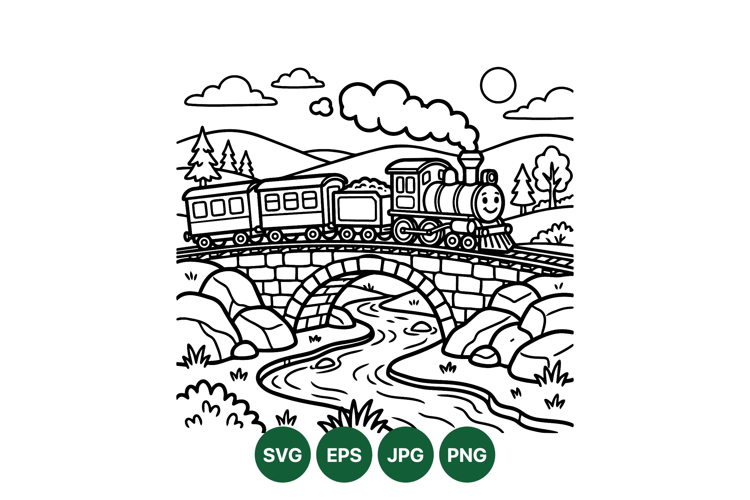 Vector Line Art Steam Train Clipart Kids Coloring Image Railroad Bridge Drawing Playful Train Design Nature Landscape Graphic Transport Svg Illustration Vintage Locomotive Art Hand Drawn Engine Cartoon Train Picture