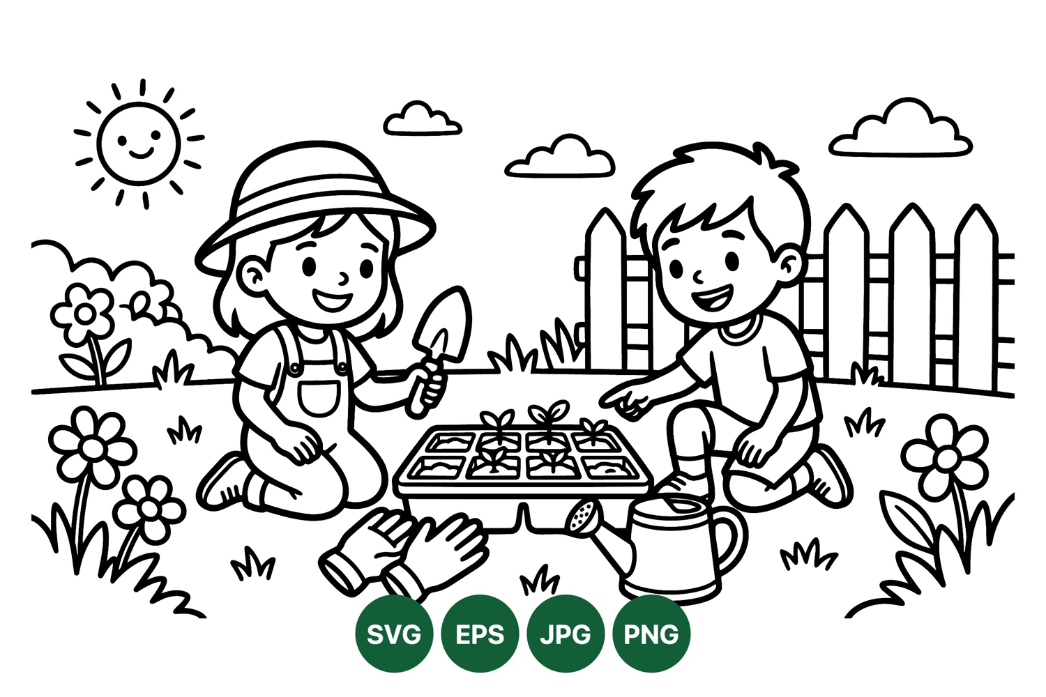 A black and white line art vector shows two cheerful children planting seeds in garden trays with gardening tools sunny weather and flowers around peaceful outdoor scene