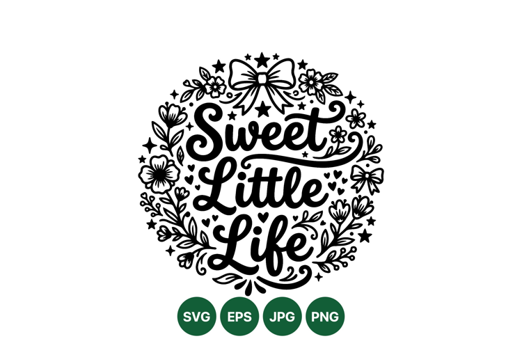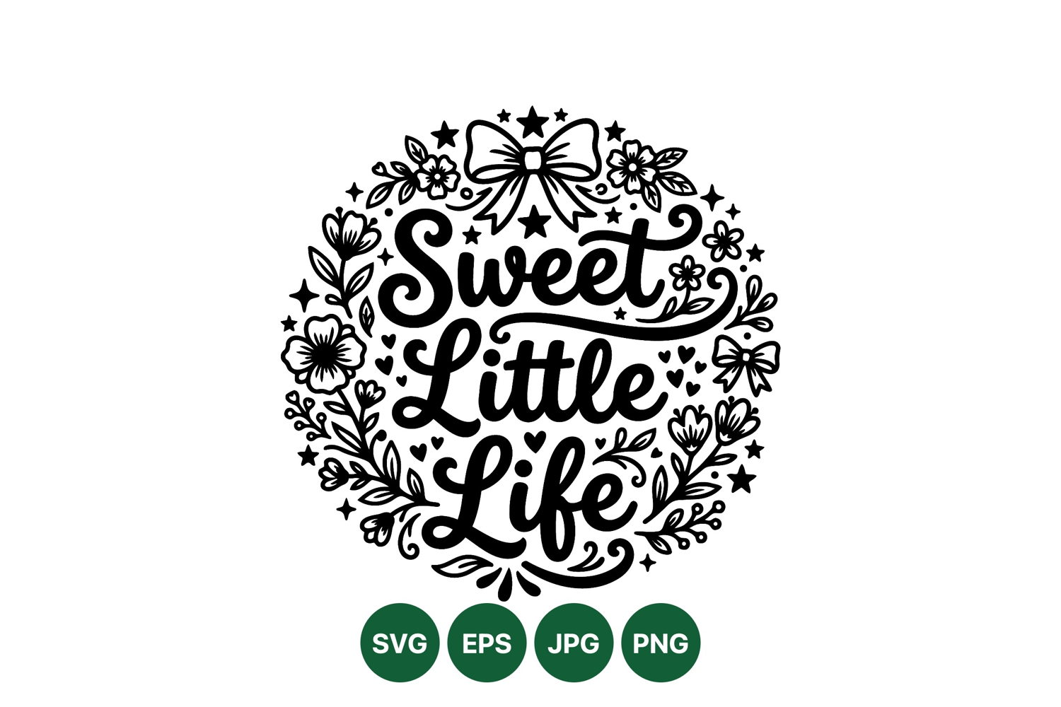 Hand drawn calligraphic quote sweet little life is encircled by floral elements stars and bows creating a charming decorative vector design with vintage style and uplifting mood