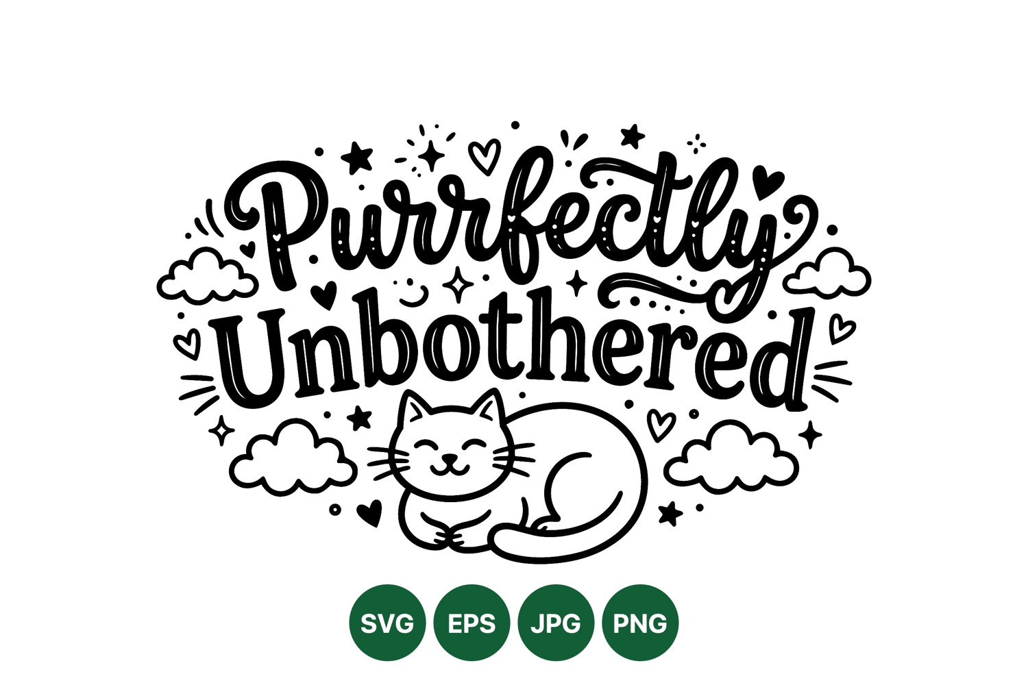 A charming black and white illustration featuring a content sleeping cat with playful handwritten text purrfectly unbothered surrounded by decorative hearts stars and clouds in simple line art style conveying calm and relaxed mood