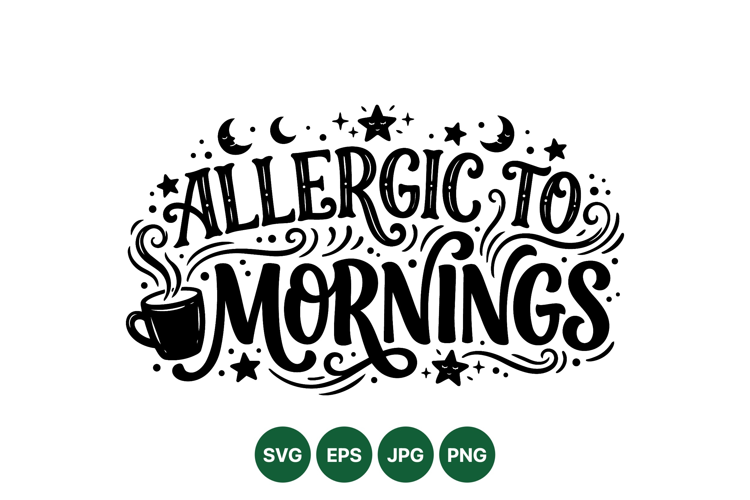 Digital Cut File Funny Coffee Quote Coffee Cup Design Allergic To Mornings Hand Drawn Typography Humorous Coffee Art Printable Kitchen Art Casual Script Lettering Morning Mug Decal Workplace Funny Sign