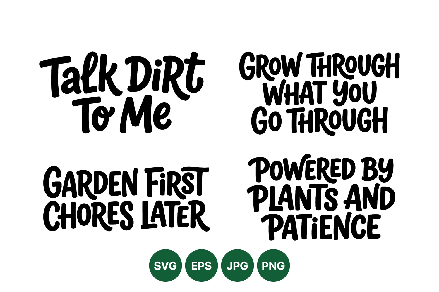 Black hand lettered quotes express gardening ideas about dirt care patience and growth with a casual bold style suitable for print social media and inspirational use.