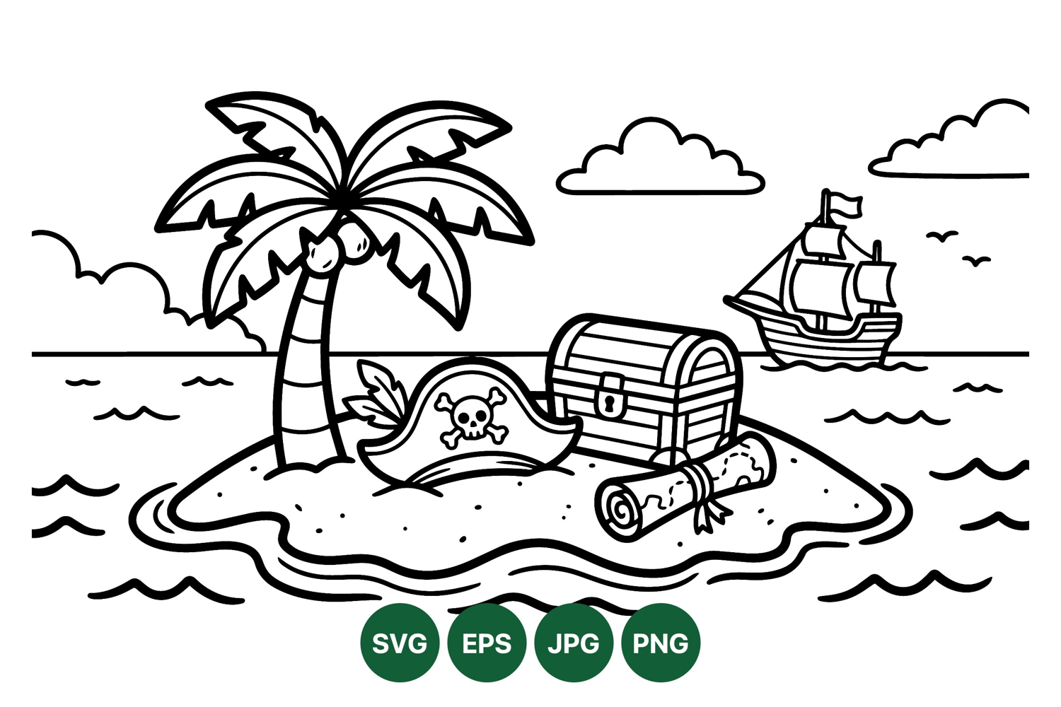 Simple black and white line vector showing a pirate treasure chest on a small island with a palm tree a skull pirate hat and a rolled map a sailing ship on the distant sea creates an adventurous mood