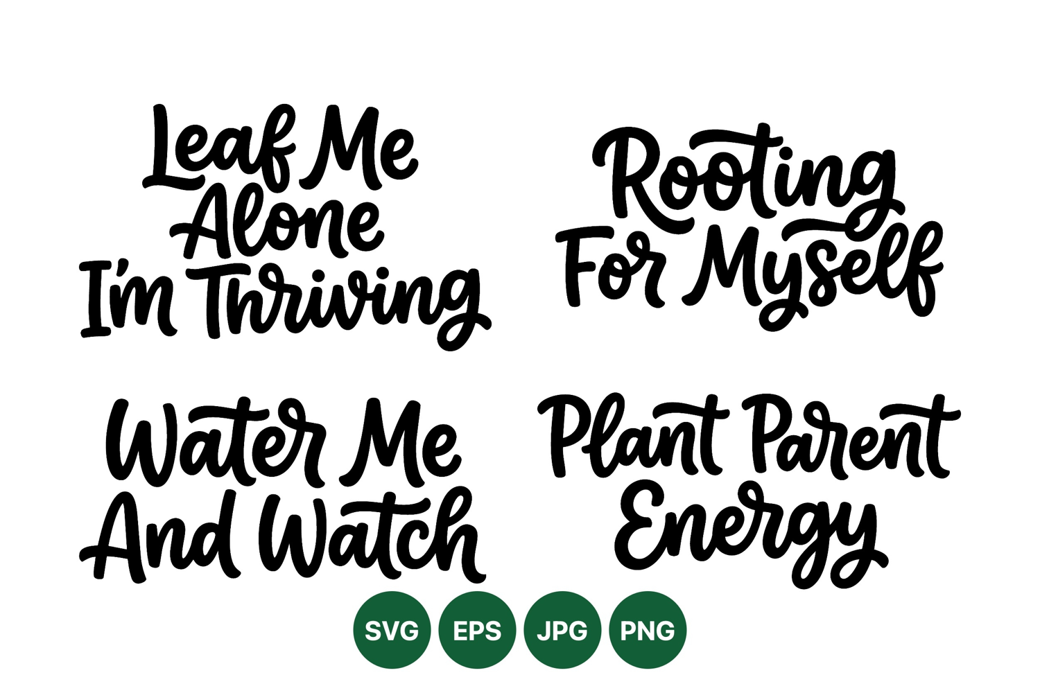 Bold black hand lettered motivational quotes including leaf me alone im thriving rooting for myself water me and watch plant parent energy on white background in a casual style
