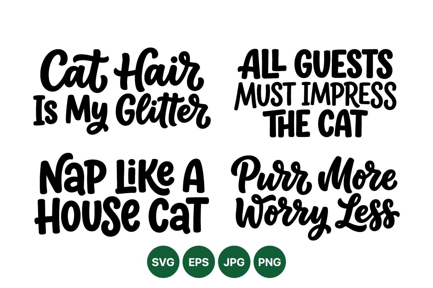 Playful hand drawn black lettering features cat themed phrases including glitter hair, guest rules, house cat naps, and purr more worry less in casual script style humorous mood