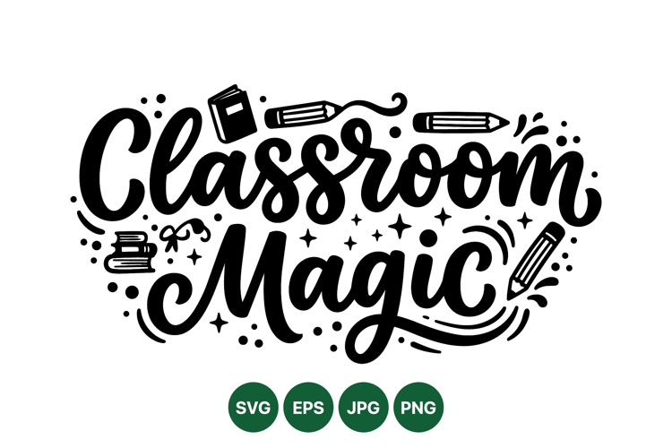 Hand lettered phrase classroom magic surrounded by pencil and book icons with decorative stars and dots in black vector style perfect for education themed designs bright mood