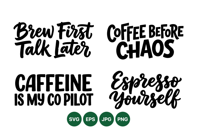 Four hand lettered coffee related phrases in black script and block styles on a white background evoke humor and energy in modern typography suitable for print and digital use