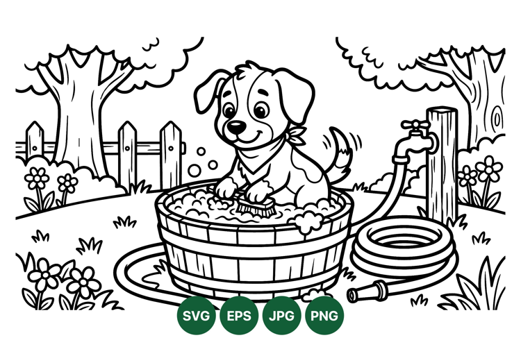 Children Coloring Page Cute Animal Drawing Playful Puppy Art Puppy Bath Clipart Dog Grooming Design Kids Activity Graphic Outdoor Pet Scene Lineart Dog Illustration Garden Dog Washing Summer Pet Care