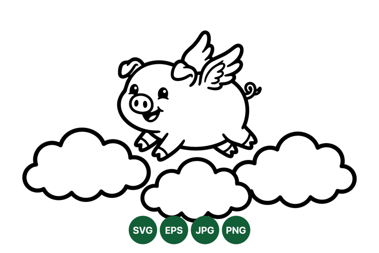 Flying Pig Vector Line Art Illustration Digital Animal Art Cute Animal Drawing Whimsical Cloud Art Fun Cartoon Clipart Playful Animal Graphic Cartoon Pig Design Children Clipart Image Simple Outline Vector